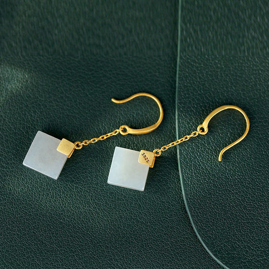 Boucles d'Oreilles Géométriques en Jade Blanc et Aiguilles en Argent 925 - Style Féminin et Raffiné