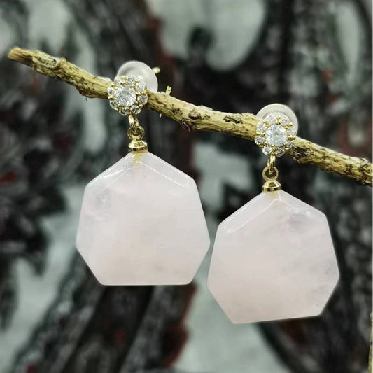 Boucles d’Oreilles Pendantes en Quartz Rose Naturel – Style Géométrique Élégant pour Femmes